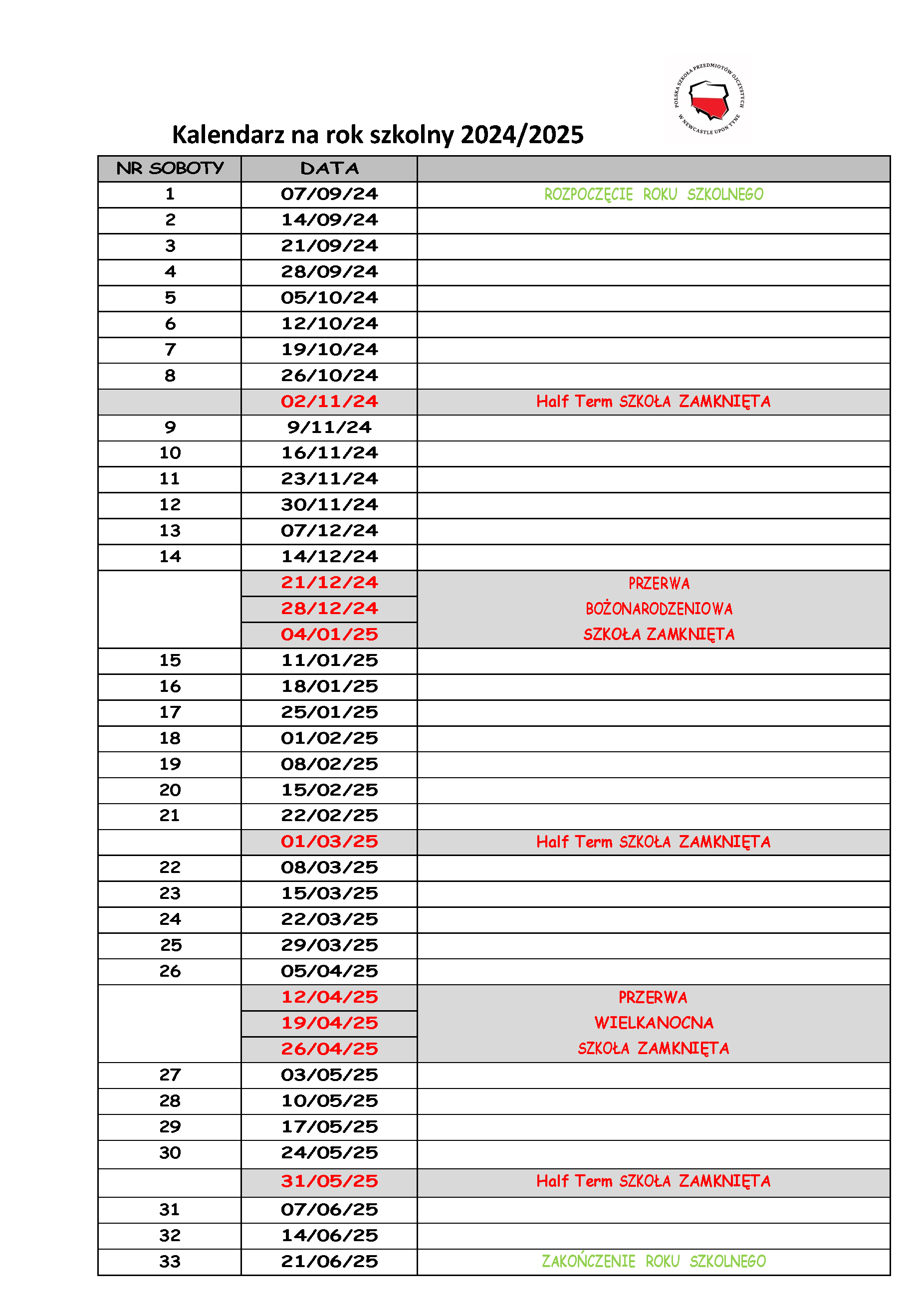 Kalendarz zajęć na rok szkolny 2024/2025